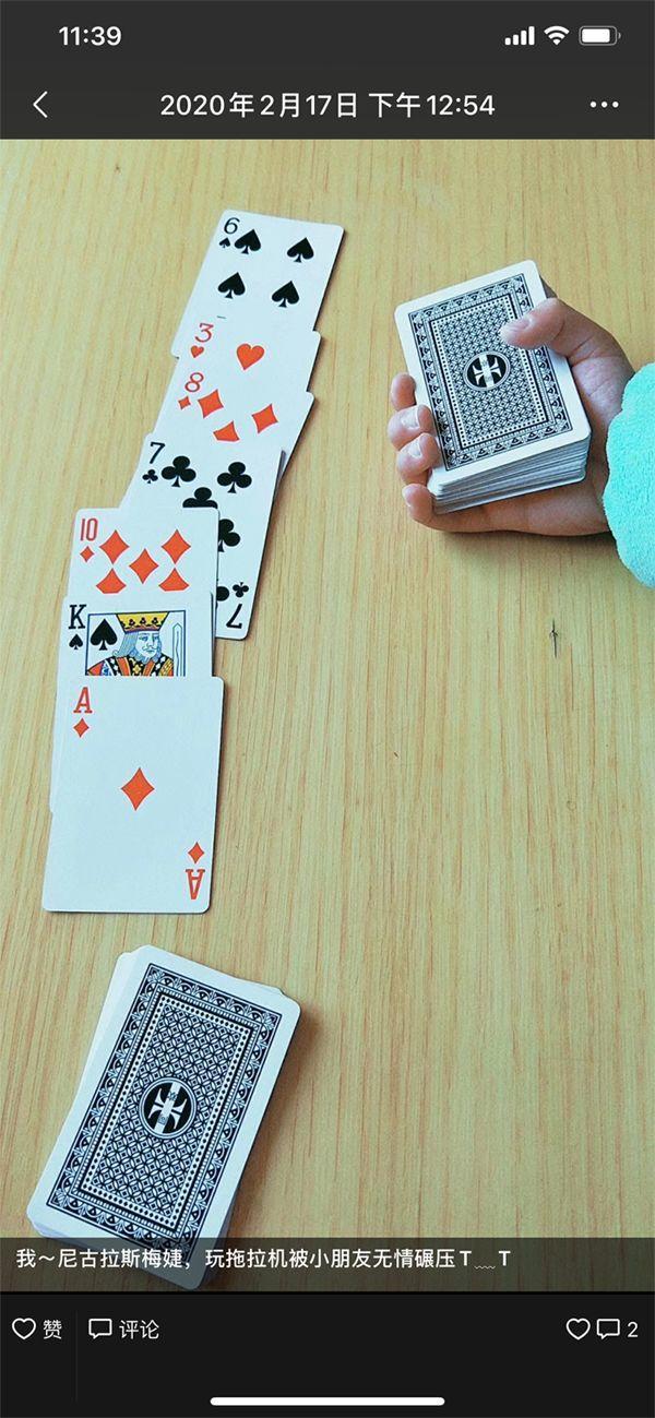 她跟侄子玩一種叫“拖拉機”的牌類游戲。按順序排列出牌,只要一張牌跟之前的數字相同,就可以收走紙牌,直到對方的牌耗完為止,“我~尼古拉斯梅婕,玩拖拉機被小朋友無情碾壓(哭臉表情)”深夜,她發了一條朋友圈。
