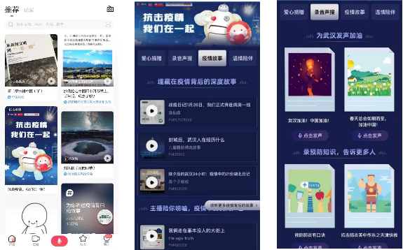 其中,在專題的“錄音聲援”板塊,內容有 “最美逆行者”們的戰疫聲音日記,也有用戶為抗疫前線人員加油鼓勁的聲音和疫情預防知識。